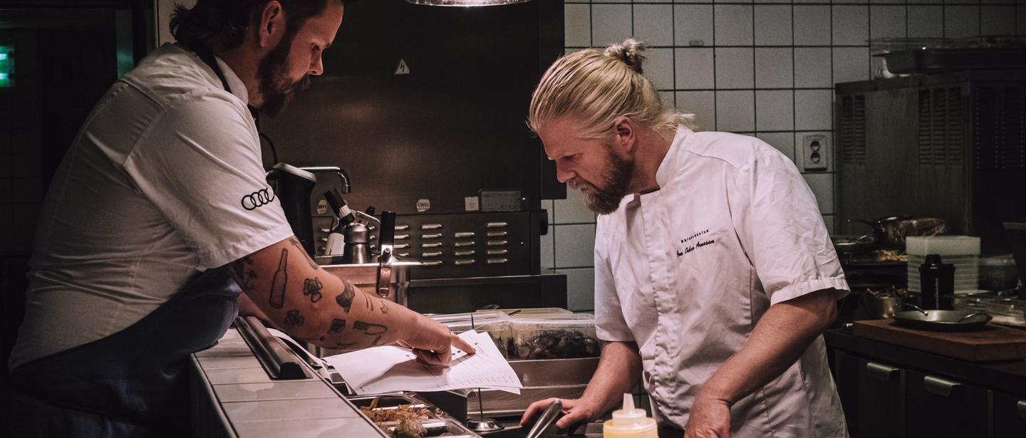 - Welcome, he says and guides me into the restaurant that I have visited so many times. He is wearing chalk-white chef's clothes with short sleeves and a feverish activity is going on behind him. I see Sarah and Jon Oskar, the other two owners, in the kitchen with the other staff. They have full focus on the ingredients in front of them, on ovens, serving dishes, bowls and saucepans. Everything that will now be coordinated and used in the coming hours.